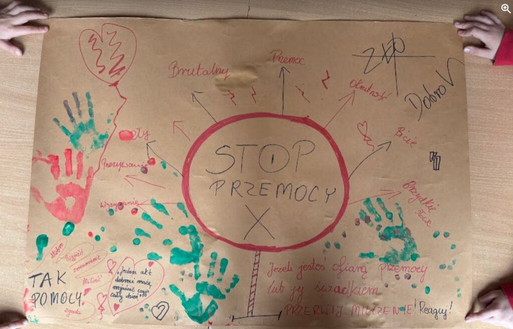W związku z obchodzonym Tygodniem Przeciwdziałania Przemocy Rówieśniczej w świetlicy szkolnej odbyła się dzisiaj prelekcja filmu „Przemoc rówieśnicza – Nie bój się o tym mówić! autorstwa Polskiej Policji oraz pogadanka na wyżej wymieniony temat. Przedstawione zostały różne formy przeciwdziałania oraz należytych reakcji. Najmłodsi wykonali ponadto plakat z własnym przedstawieniem tej problematyki.