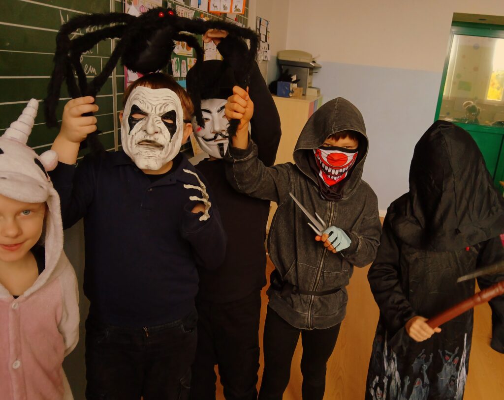 W tym tygodniu na języku angielskim w klasach 1-3 królowały przebrania i Halloween! Na zajęciach graliśmy w gry ruchowe, śpiewaliśmy i wykonywaliśmy prace plastyczne. Było wesoło i strrrrasznie 🙂
