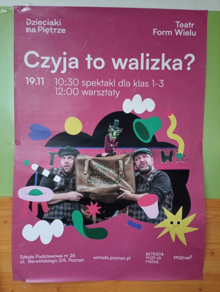 Środa 19.11.2025 upłynęła klasom l-lll na zgłębianiu tajemnic teatru i pracy aktora. Najpierw dzieci obejrzały spektakl grupy Teatr Form Wielu pt. „Czyja to walizka?”, zorganizowany przez Estradę Poznańską w ramach projektu Dzieciaki na Piętrze, a następnie, po krótkiej przerwie mogły wykonać ćwiczenia aktorskie i lalkarskie pod kierunkiem naszych gości. Było to bardzo emocjonujące i pełne dziecięcej radości spotkanie.
