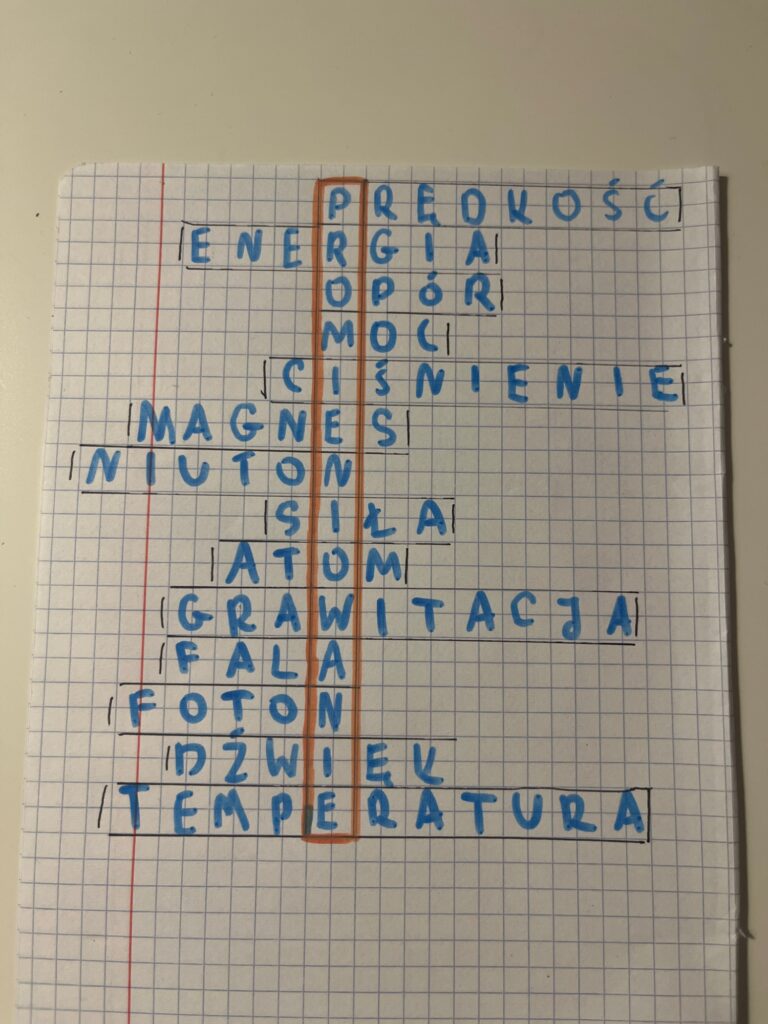Uczniowie klas 7 i 8, w ramach innowacji pedagogicznej „Fizyka wokół nas”, realizowali kolejne listopadowe zadanie – krzyżówkę fizyczną. Ćwiczenie miało na celu utrwalenie wiedzy z fizyki w atrakcyjnej, angażującej formie. Uczniowie z dużym zaangażowaniem rozwiązywali przygotowane hasła, rozwijając jednocześnie logiczne myślenie.