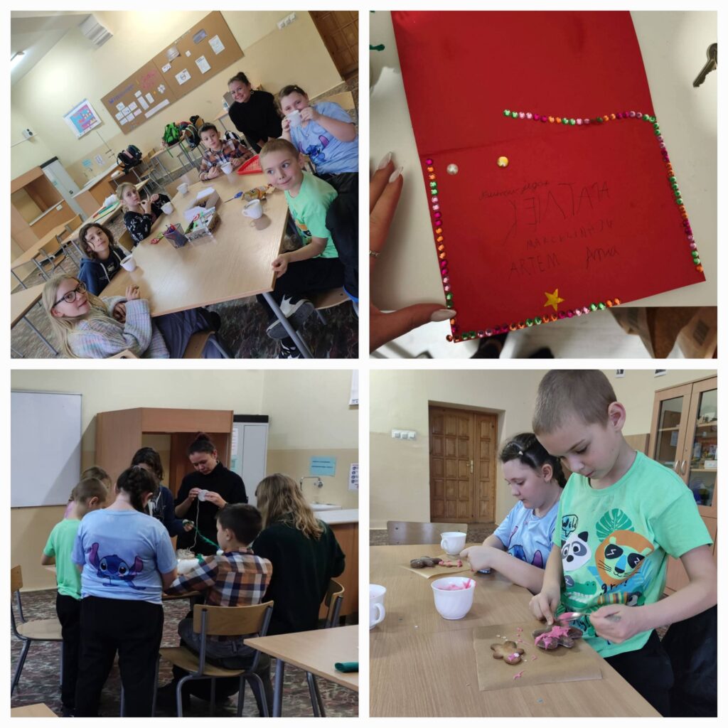 W atmosferze pełnej życzliwości, przy dźwiękach płynącej muzyki świątecznej, mali twórcy zanurzyli się w świat kreatywności. Z kubkami ciepłego kakao w rękach, ozdabiali pierniczki, które później mogli zabrać do domu. Kolejnym krokiem w twórczym przedsięwzięciu było przygotowanie ozdób – ręcznie robionych kartek i miniaturek choinek, które będą dołączone do paczek, przygotowanych przez wolontariuszy dla seniorów z Domu Pomocy Społecznej w Poznaniu.