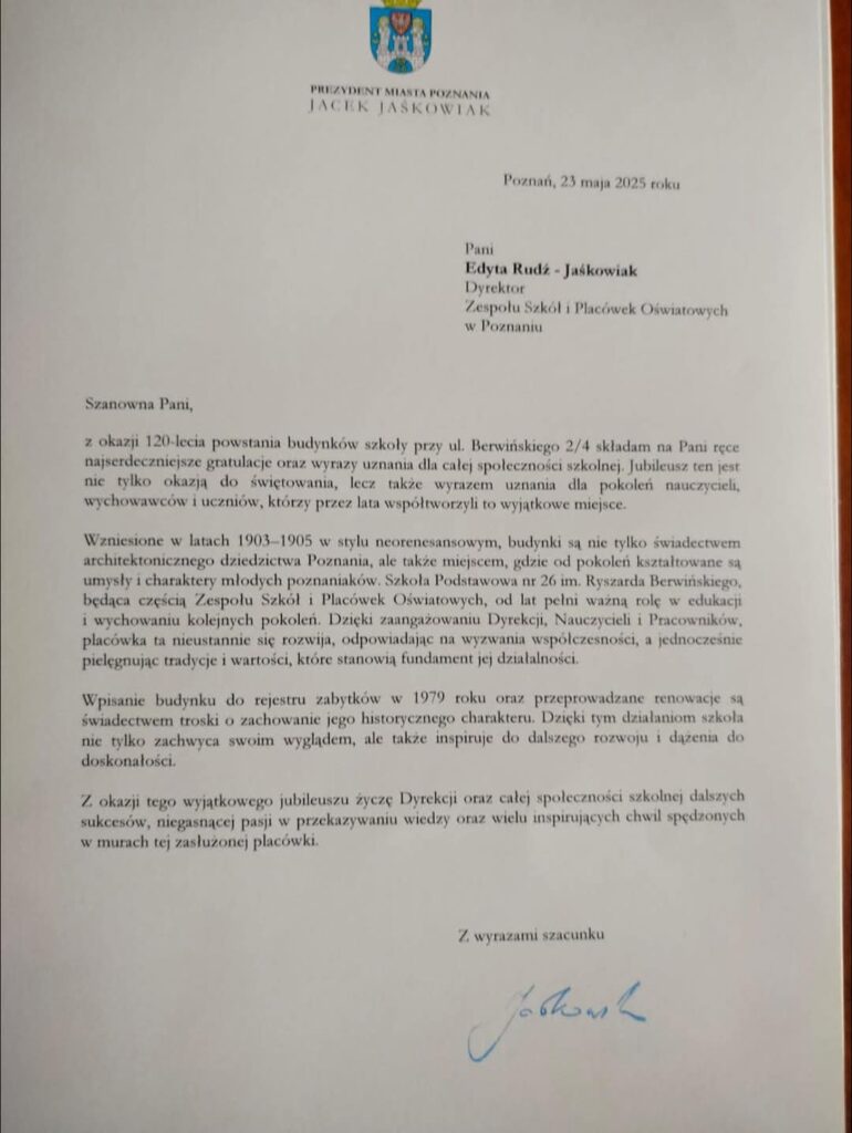 Prezydenta Miasta Poznania z okazji 120 lecia budynku Szkoły