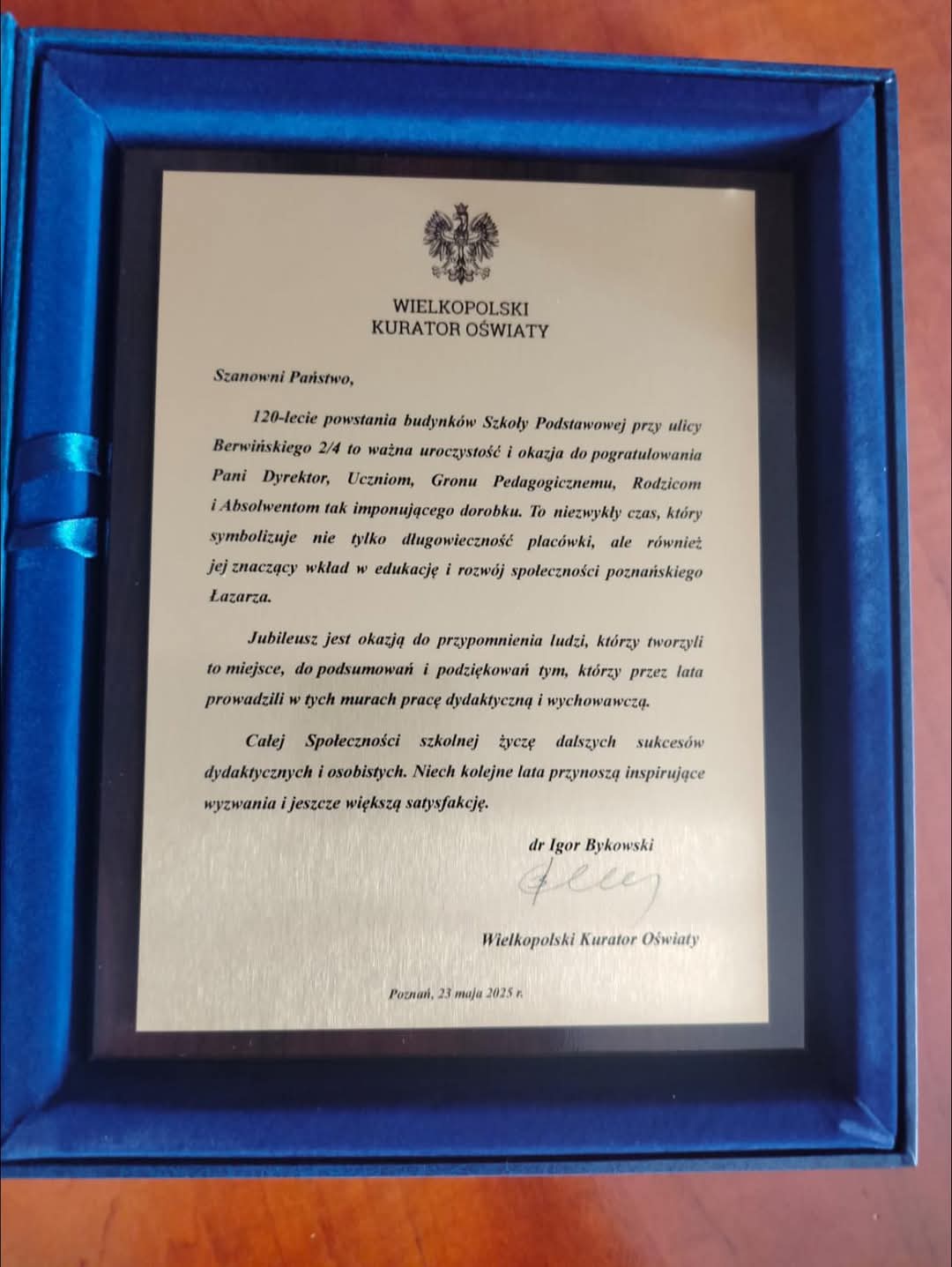Gratulacje Wielkopolskiego Kuratora Oświaty z okazji 120-lecia budynku Szkoły