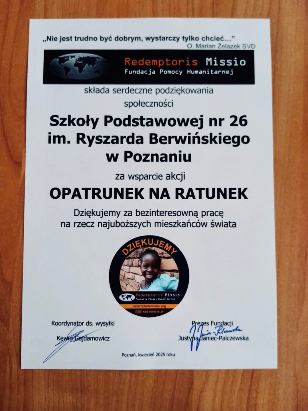 Podziękowanie za udział w akcji „Opatrunek na ratunek” 2025