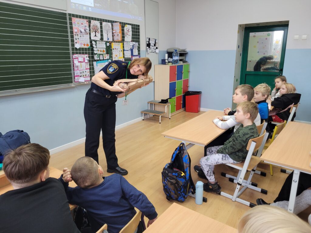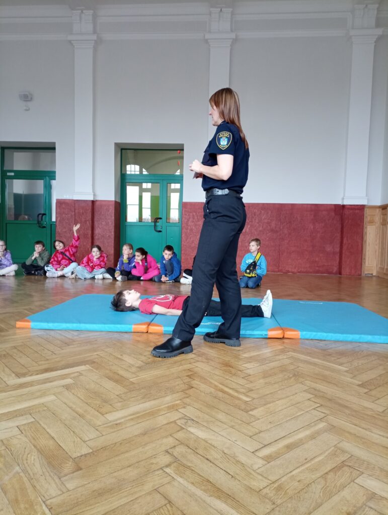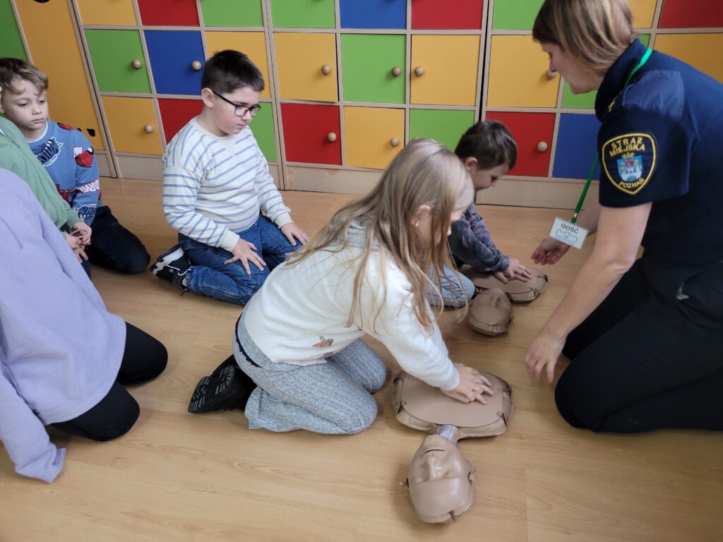 Dzieci uczyły się, jak reagować w nagłych sytuacjach – sprawdzić oddech, ułożyć w pozycji bezpiecznej oraz jak prawidłowo wezwać pomoc, dzwoniąc pod 112.